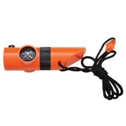 - Plastic whistle with built-in LED light, compass and nylon lanyard