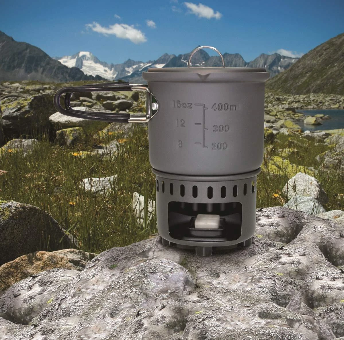Our historic solid fuel cook set with stand and pot inspired us to create this set. We felt that the time was ripe for a new cook set for solid fuel, which also had to include a pot, of course. And the format of the pot needed to be ideal for using Esbit solid fuel tablets. Perfect for boiling water, for bringing water to the boil for drinks or ready meals and for heating up meals and drinks. We also attached considerable importance to small pack dimensions in developing this cook set. That’s why even the stand, for example, can be stored in the pot.