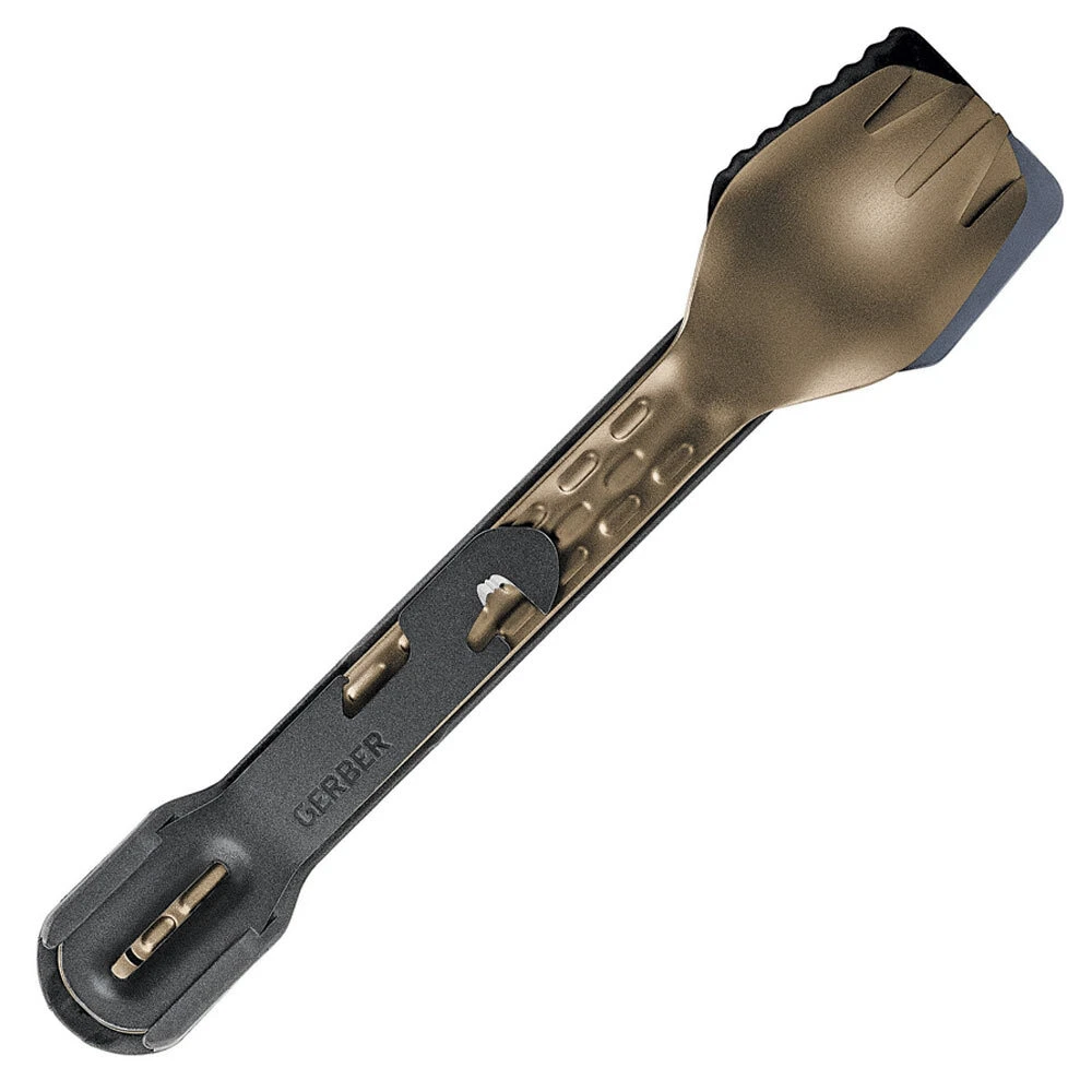 7.75″ overall. Aluminium fork, aluminium spoon, nylon spatula with silicone overmold, and four function multi-tool.