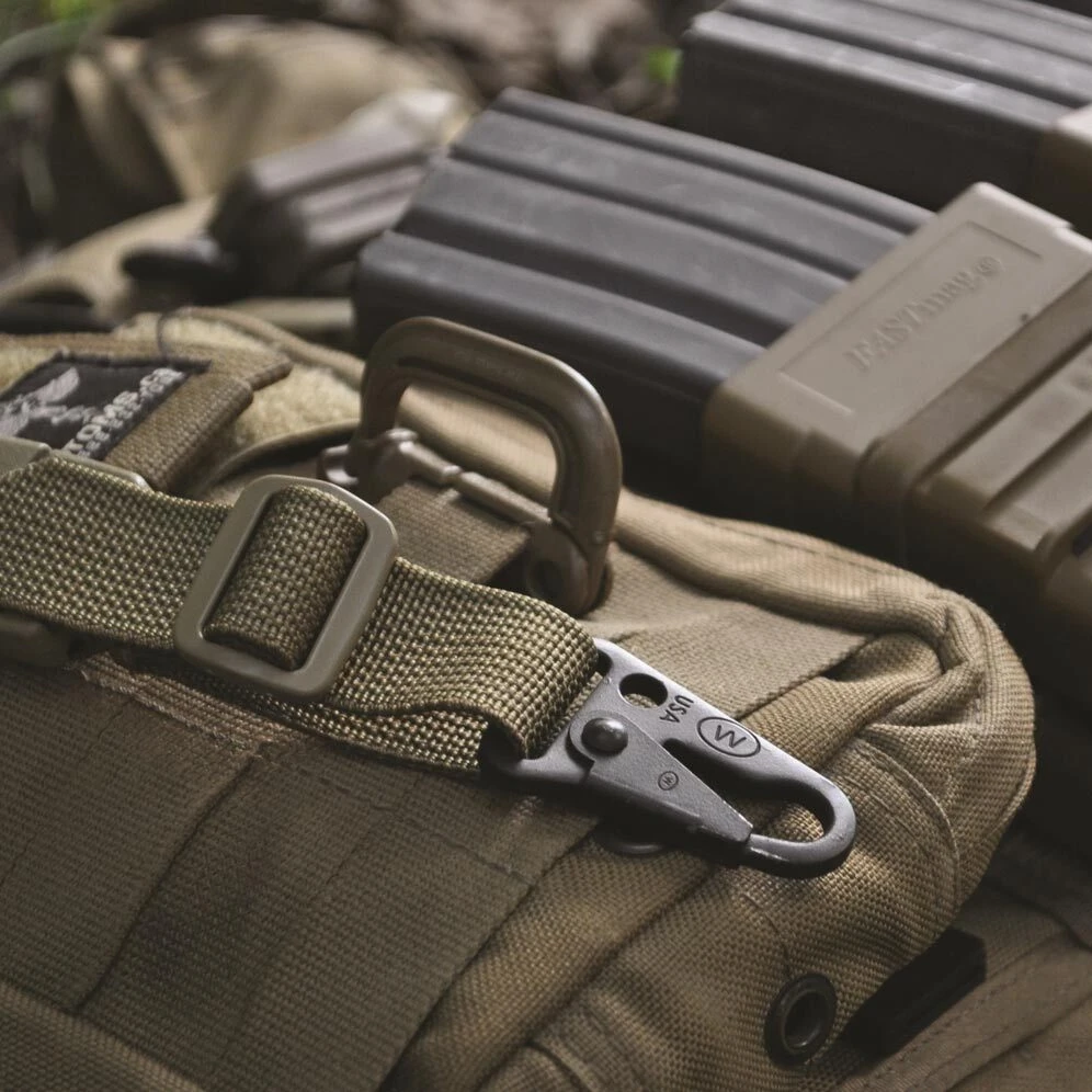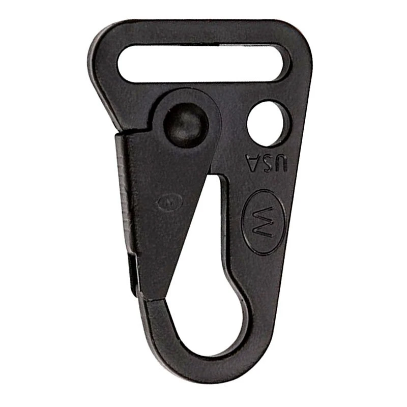 The C.L.A.S.H. Hook [Conventional Latch Attachment Snap Hook] was designed to meet the needs of sling and strap applications that require a quick-on feature with spring-loaded retention gate. The body is made from one solid steel stamping and has a slot designed to accept 1” webbing for weapon slings. If your application demands an all metal heavy tensile load system, C.L.A.S.H. Hook is the easy choice.
