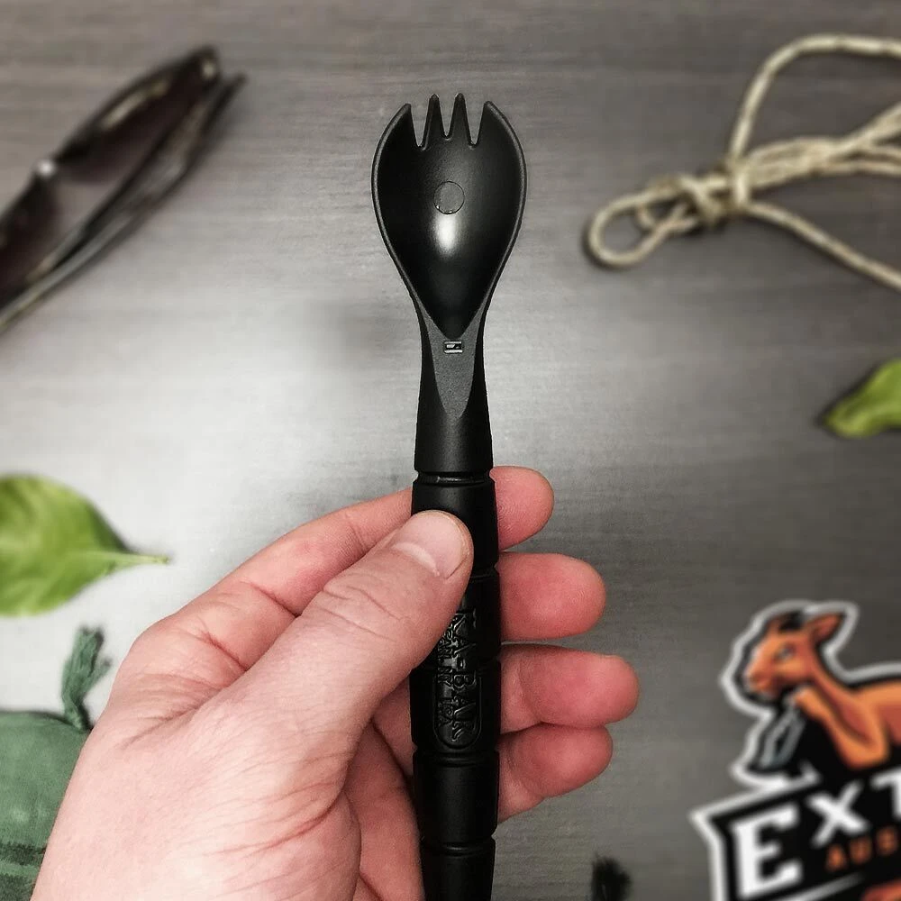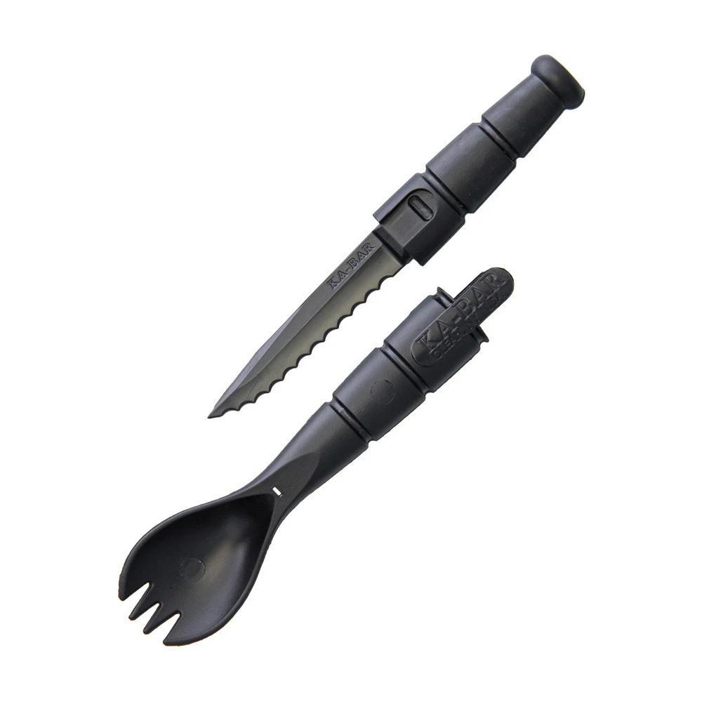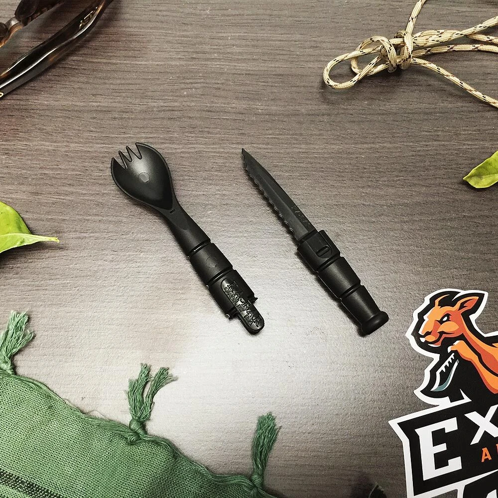 - Fork/spoon combo with a hidden 2.5″ serrated knife in the handle
