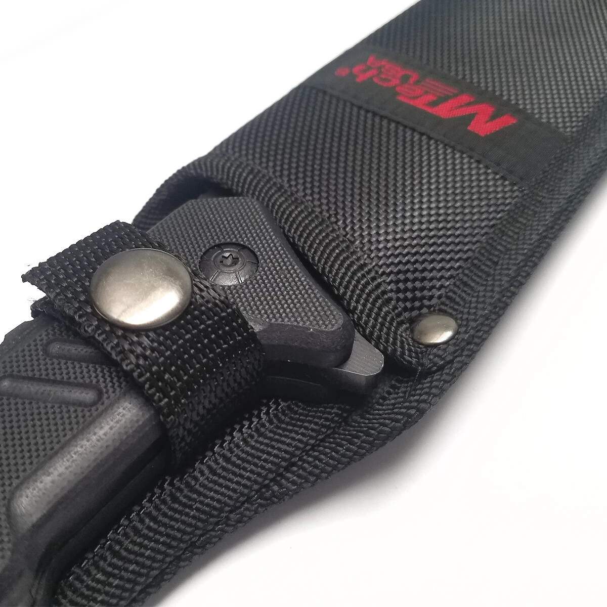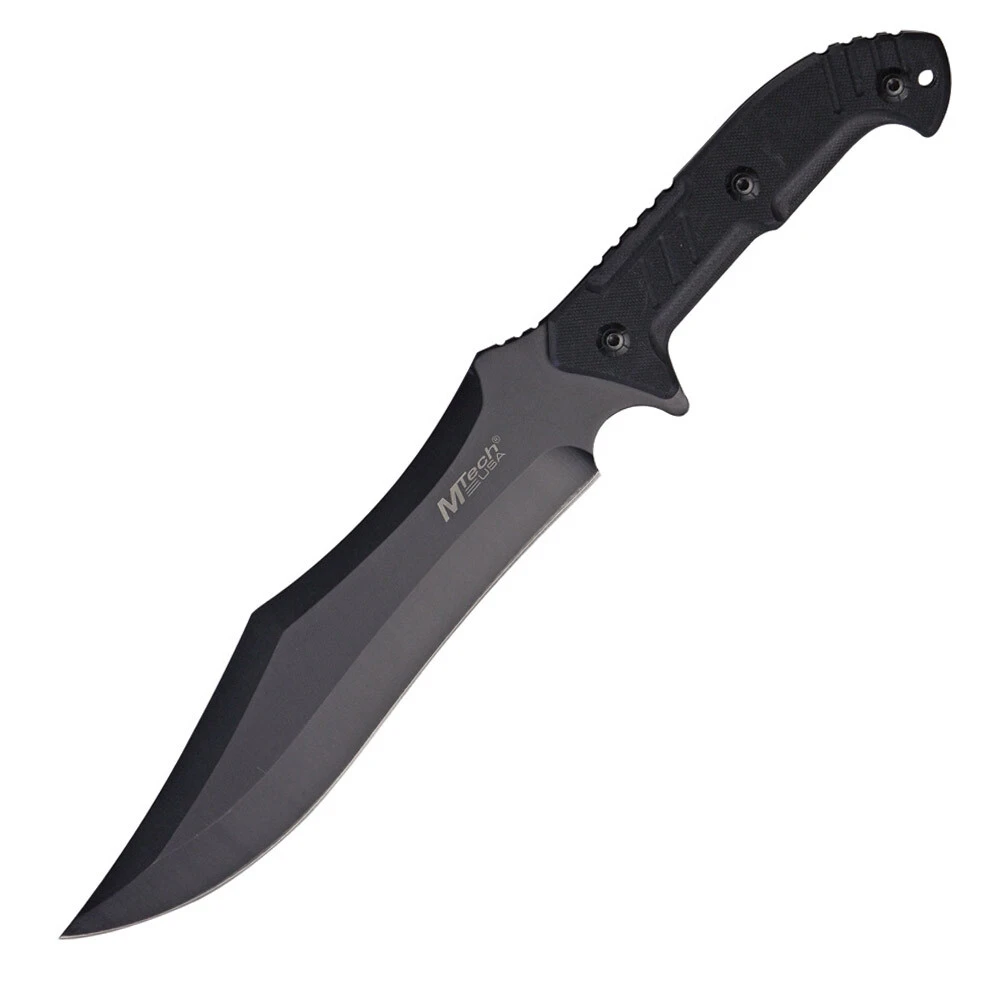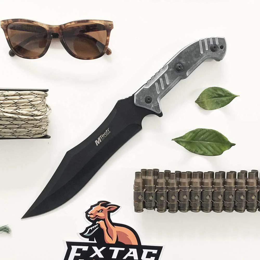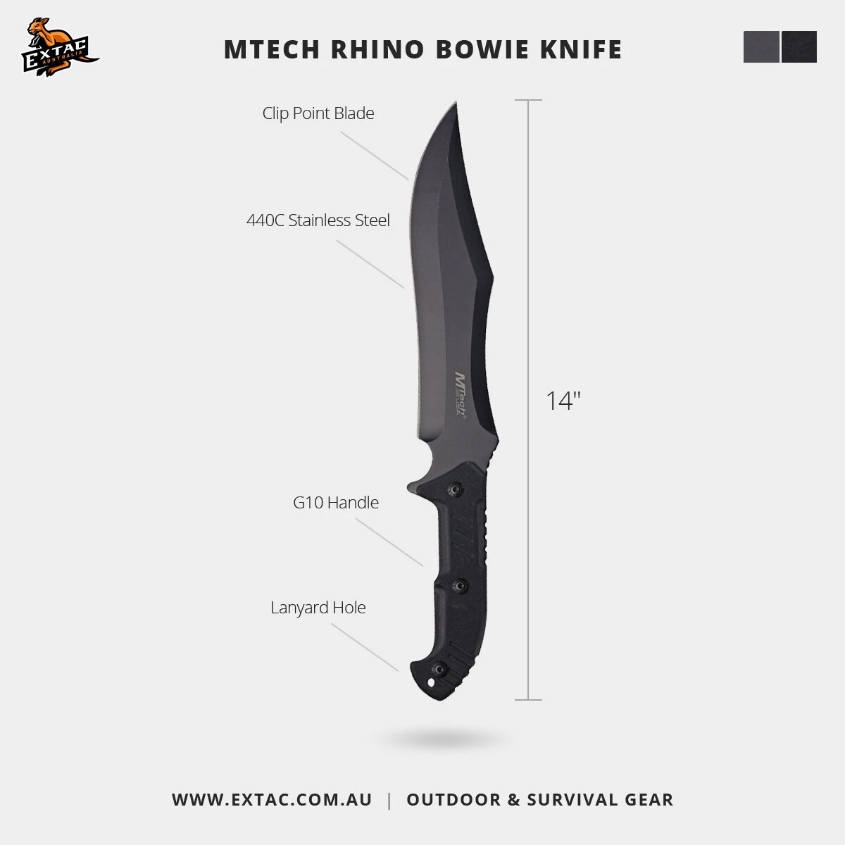 The MTech Rhino Bowie is an awesome hard use tactical blade and measures 14″ overall. The big 8 1/2″ black finish 440C stainless clip blade is full tang and is excellent for all chopping and cutting tasks you send its way. Textured black G-10 handle scales provide excellent grip in all conditions. Included with the MTech Rhino is a black nylon belt sheath.