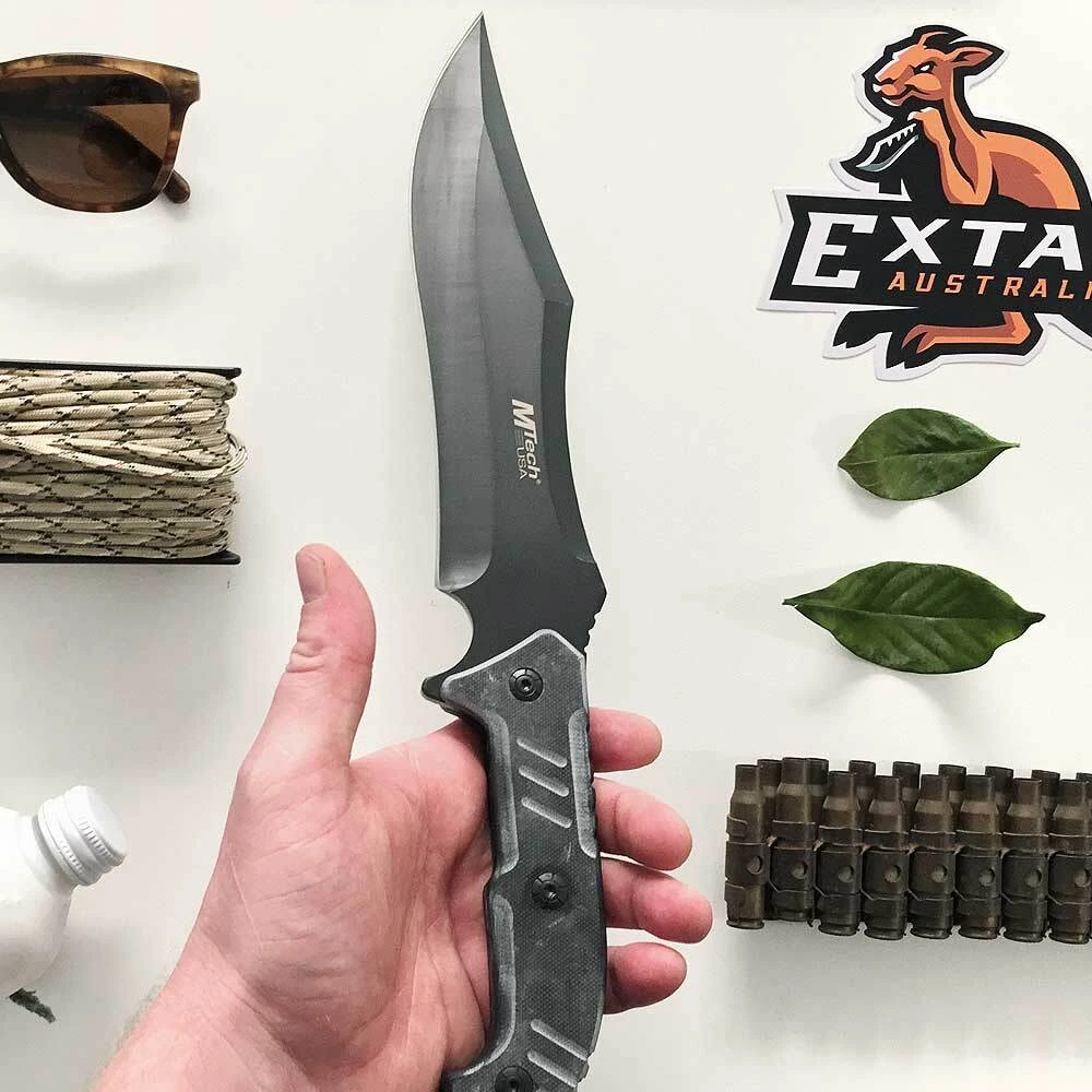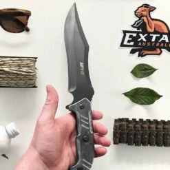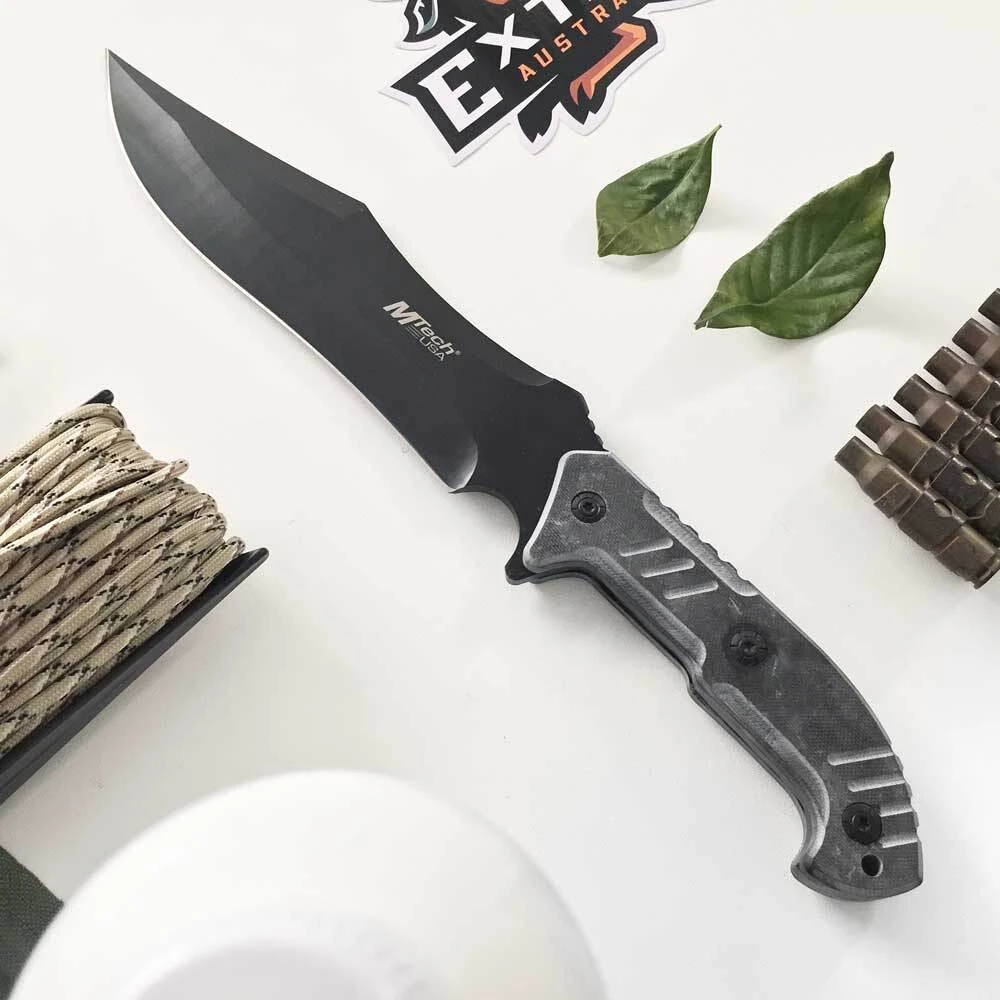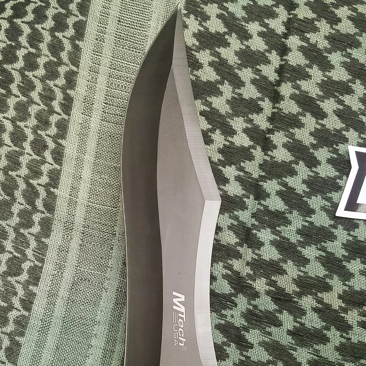 The MTech Rhino Bowie is an awesome hard use tactical blade and measures 14″ overall. The big 8 1/2″ black finish 440C stainless clip blade is full tang and is excellent for all chopping and cutting tasks you send its way. Textured black G-10 handle scales provide excellent grip in all conditions. Included with the MTech Rhino is a black nylon belt sheath.