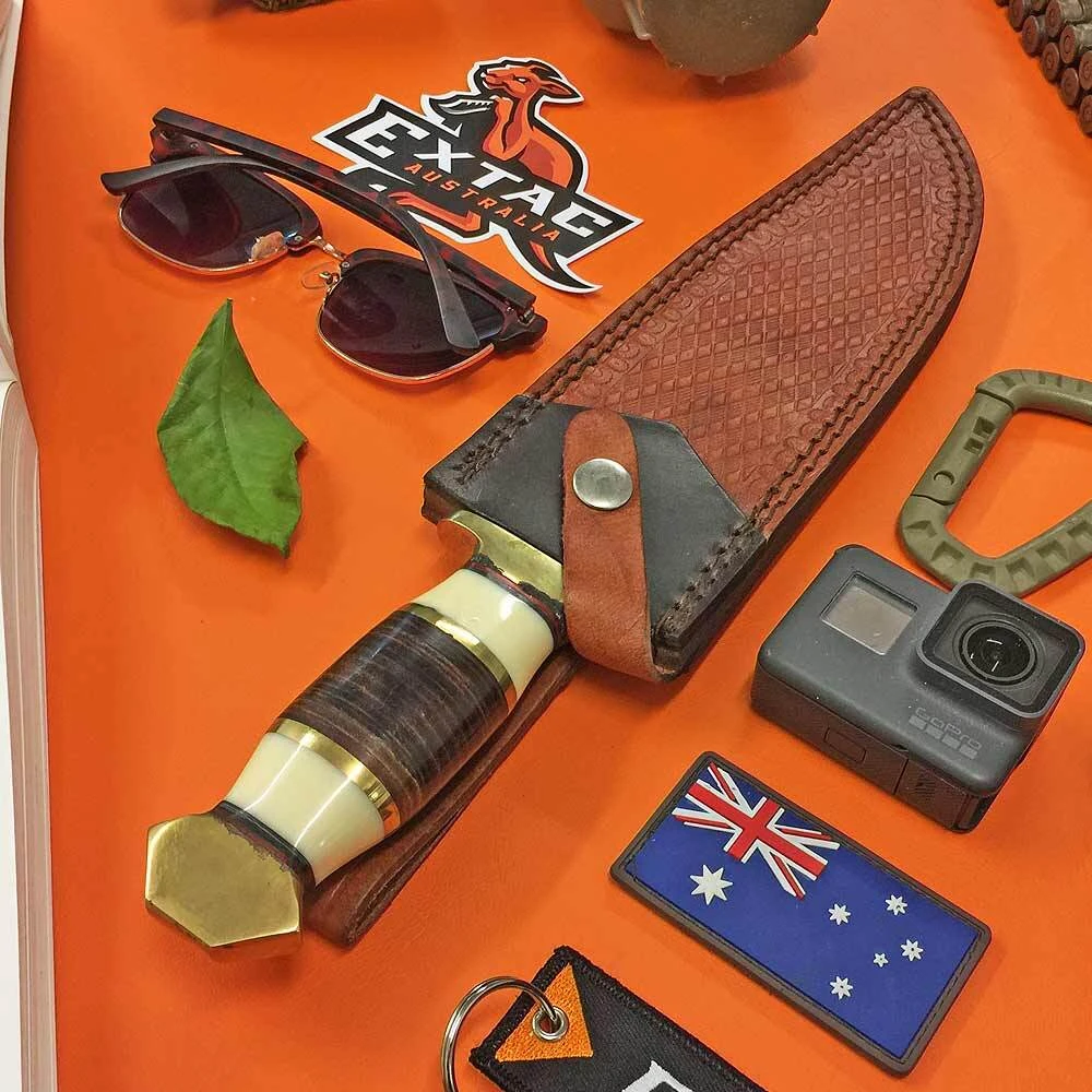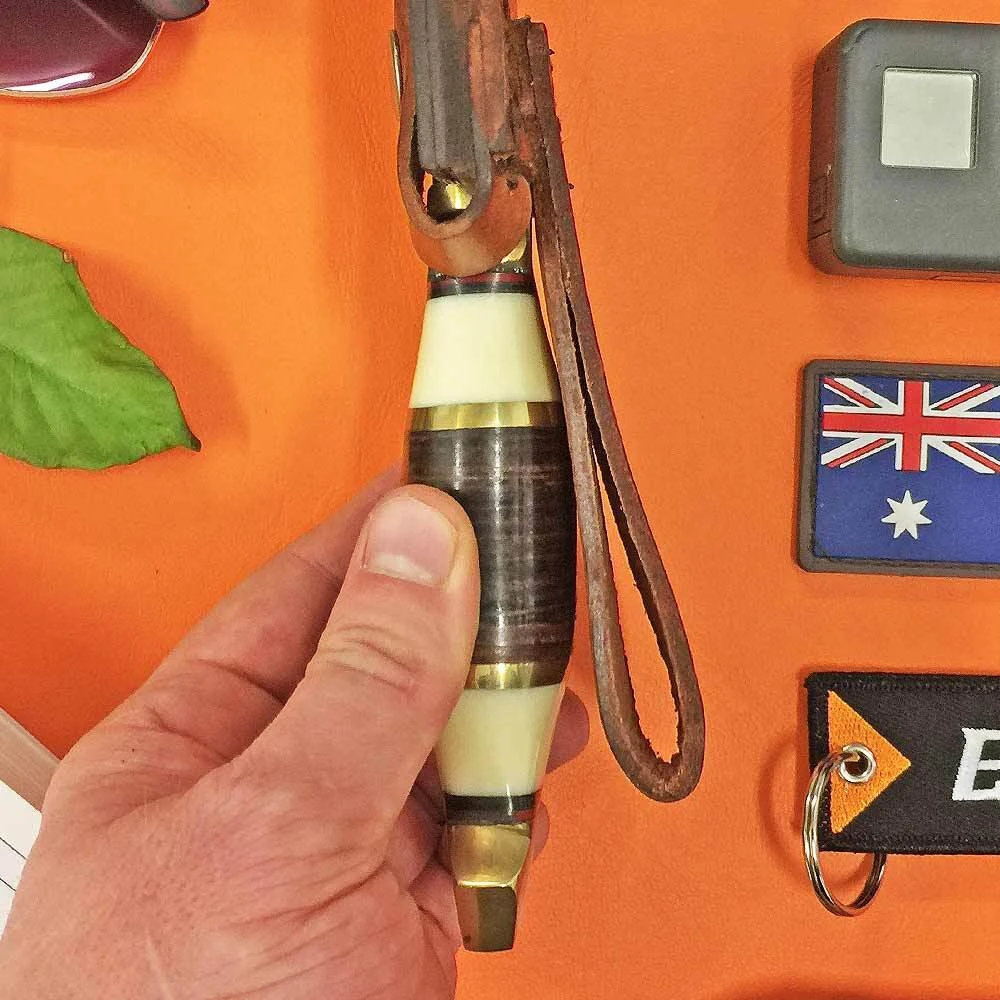 - Stacked leather and white smooth bone handle