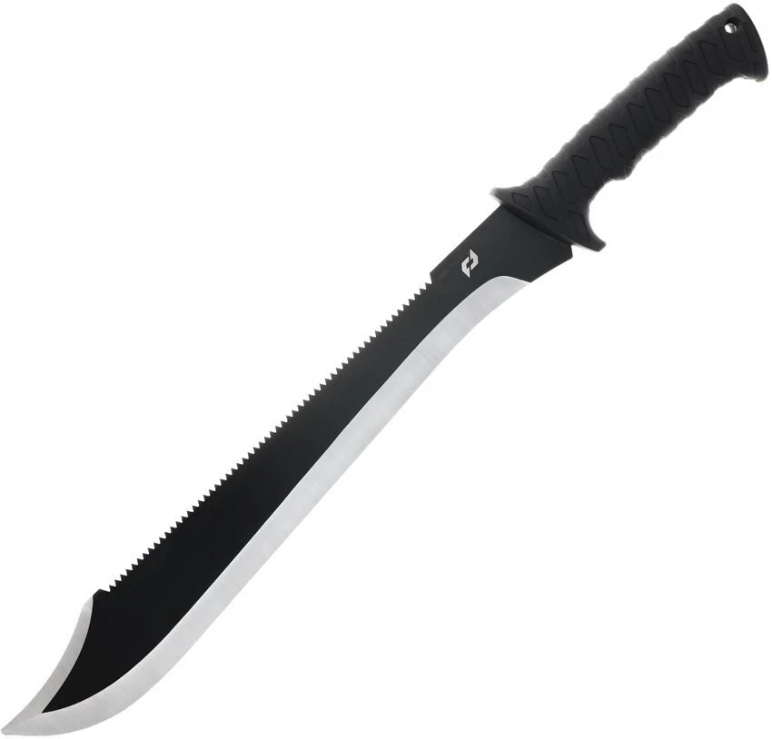 - 15″ (38.1cm) black oxide coated sawback 3Cr13 stainless blade