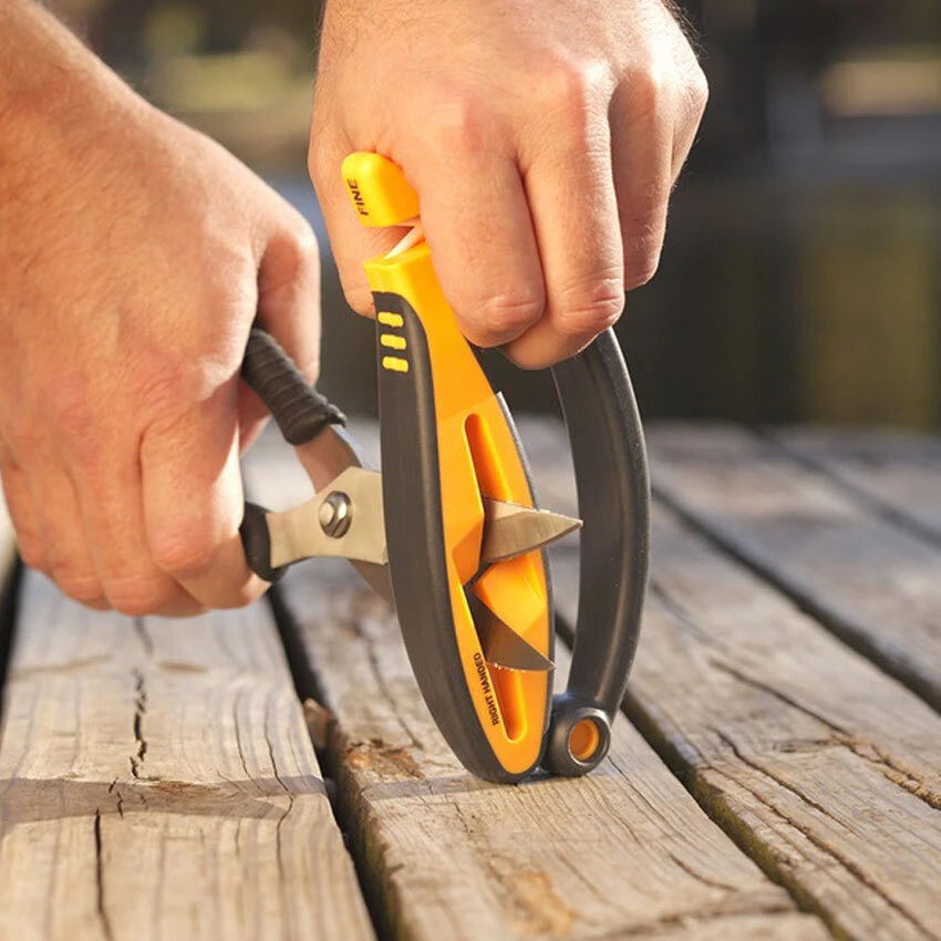 These fixed abrasive components create a preset sharpening angle that guarantees results every time no matter where you are sharpening your knife. The scissors sharpening slot in the handle of the JIFFY-Pro has been enlarged to accommodate game shears as well. It uses a patented, “FLOATING” carbide rod that adjusts to fit the precise bevel of the blades and has a soft grip rubber handle for a firm, comfortable grip in all conditions