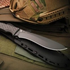 - 6.63″ (16.84cm) black powder coated 1095 Cro-Van carbon steel blade