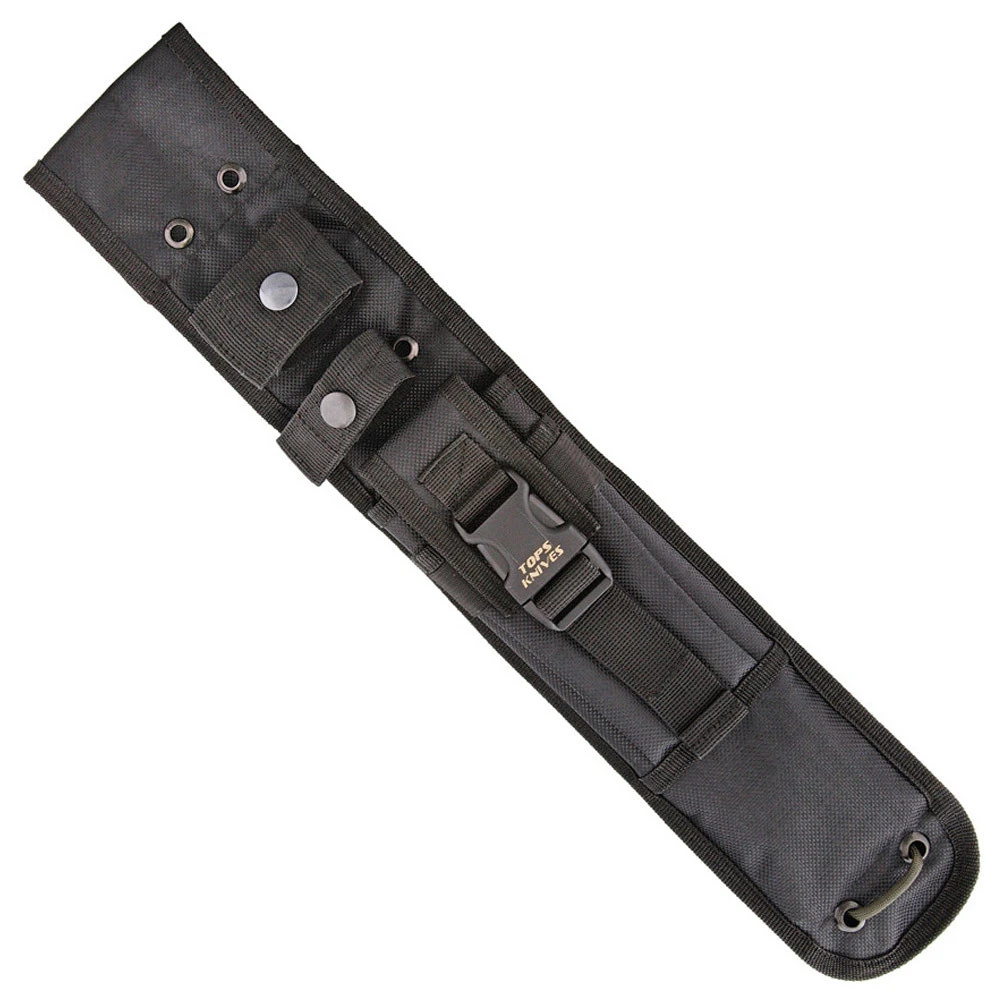 - Black ballistic nylon belt sheath with MOLLE backing and survival whistle